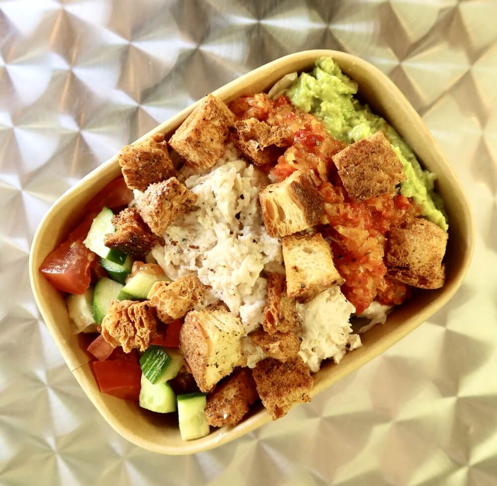 Choose your protein & dressing. Standard base Mixed leaves, cucumber, tomato, smash avo, Giardiniera, topped with croutons