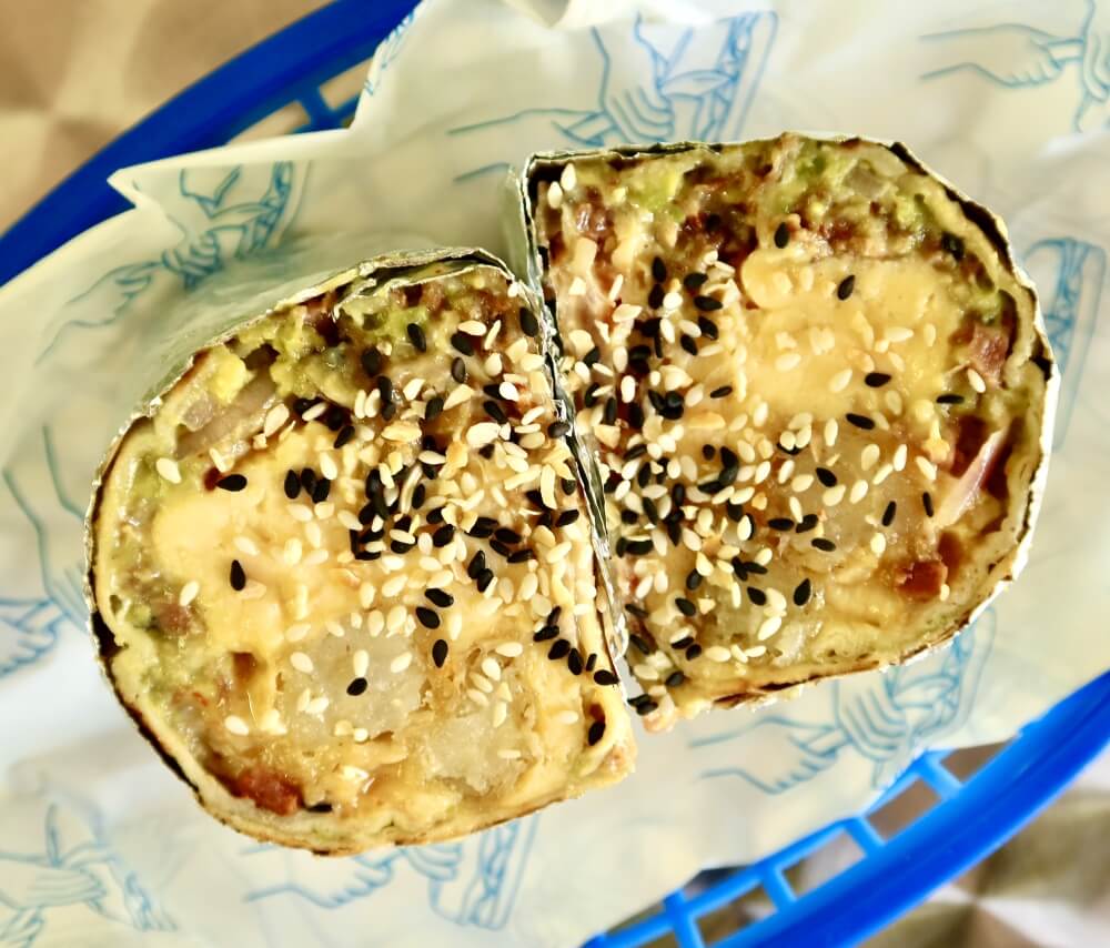 Egg, avo, cheddar, tots, onion, spicy mayo, seasoning